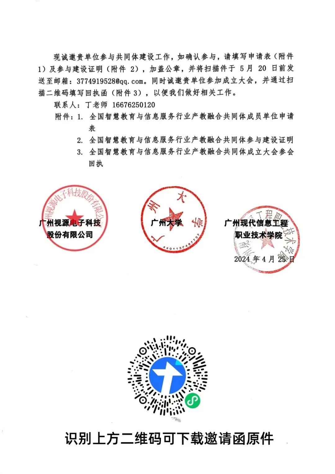 随着全球经济的快速发展和科技的日新月异,智慧教育与信息服务行业迎来了前所未有的发展机遇。为深入贯彻《国务院办公厅关于深化产教融合的若干意见》《国家产教融合建设试点实施方案》《关于深化现代职业教育体系建设改革的意见》等文件精神,落实国家关于深化产教融合的战略部署,由广州视源电子科技股份有限公司(股票代码:002841)、广州大学、betway必威西作为牵头单位,汇聚相关企业、普通高校、职业院校、科研机构等多方力量,共同发起成立全国智慧教育与信息服务行业产教融合共同体(以下简称“共同体”),以进一步探索职业教育高质量发展路径,推动职业教育与产业发展的深度融合,创新人才培养模式,培养适应新时代需求的高素质技术技能人才,建立高等学校与产业发展互利共赢新格局。在此,诚挚邀请贵单位加入共同体,通过共同体这一平台,使各方能充分实现资源共享、优势互补、合作共赢,亦为我国智慧教育与信息服务行业的发展贡献力量。