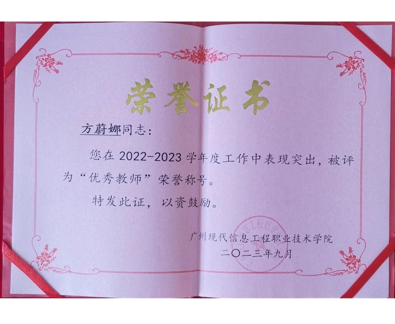 在教师岗位上,方蔚娜老师持续发光发热,她秉承着“匠心育人,追求卓越”的精神,积极发挥引领作用,连续三年被学校评为“优秀教师”。此外,她积极参与学校组织的教学能力比赛、主题比赛等各项活动,取得了丰硕的成果。