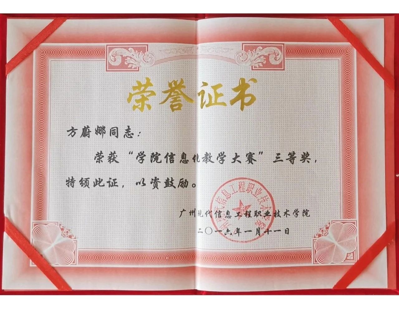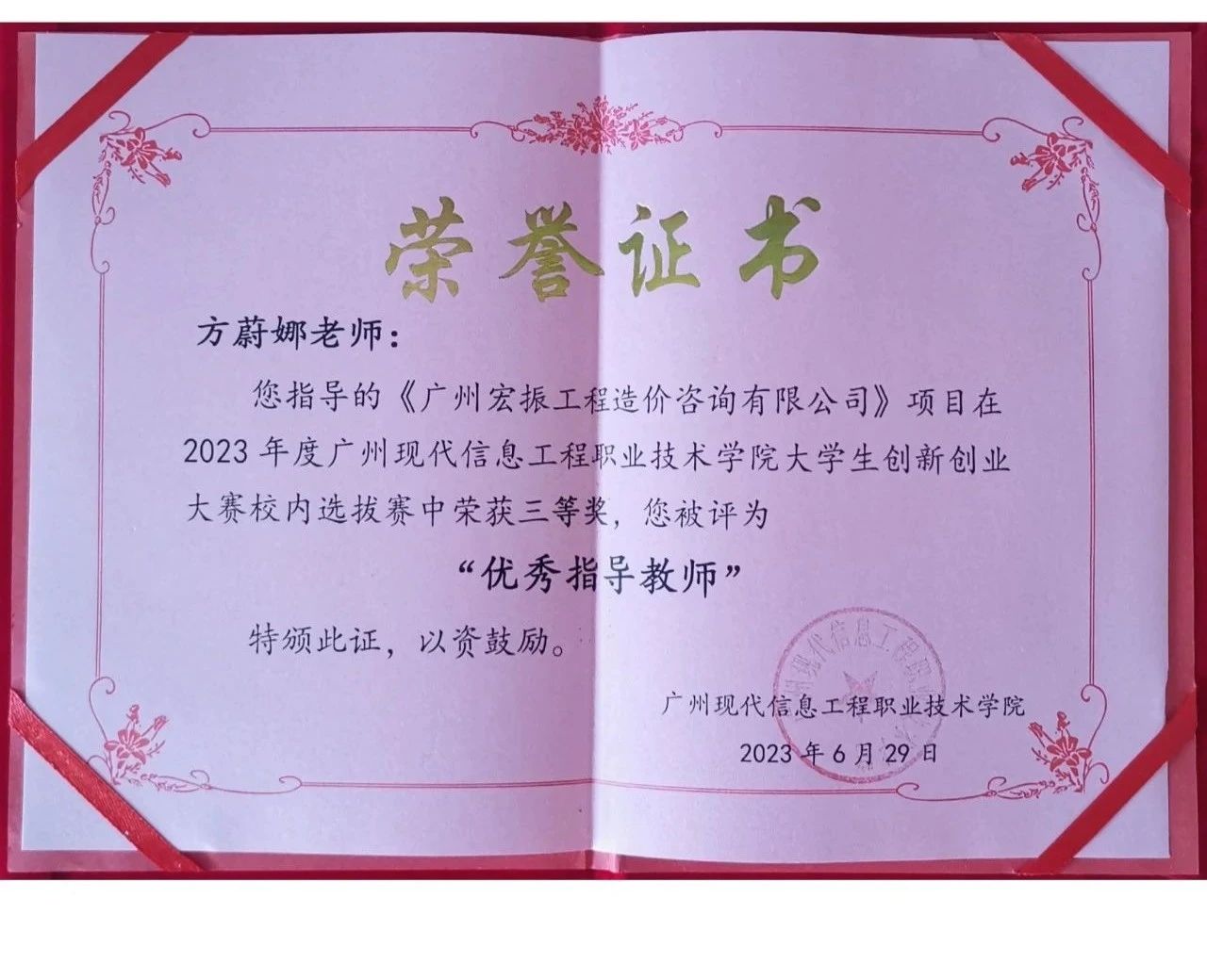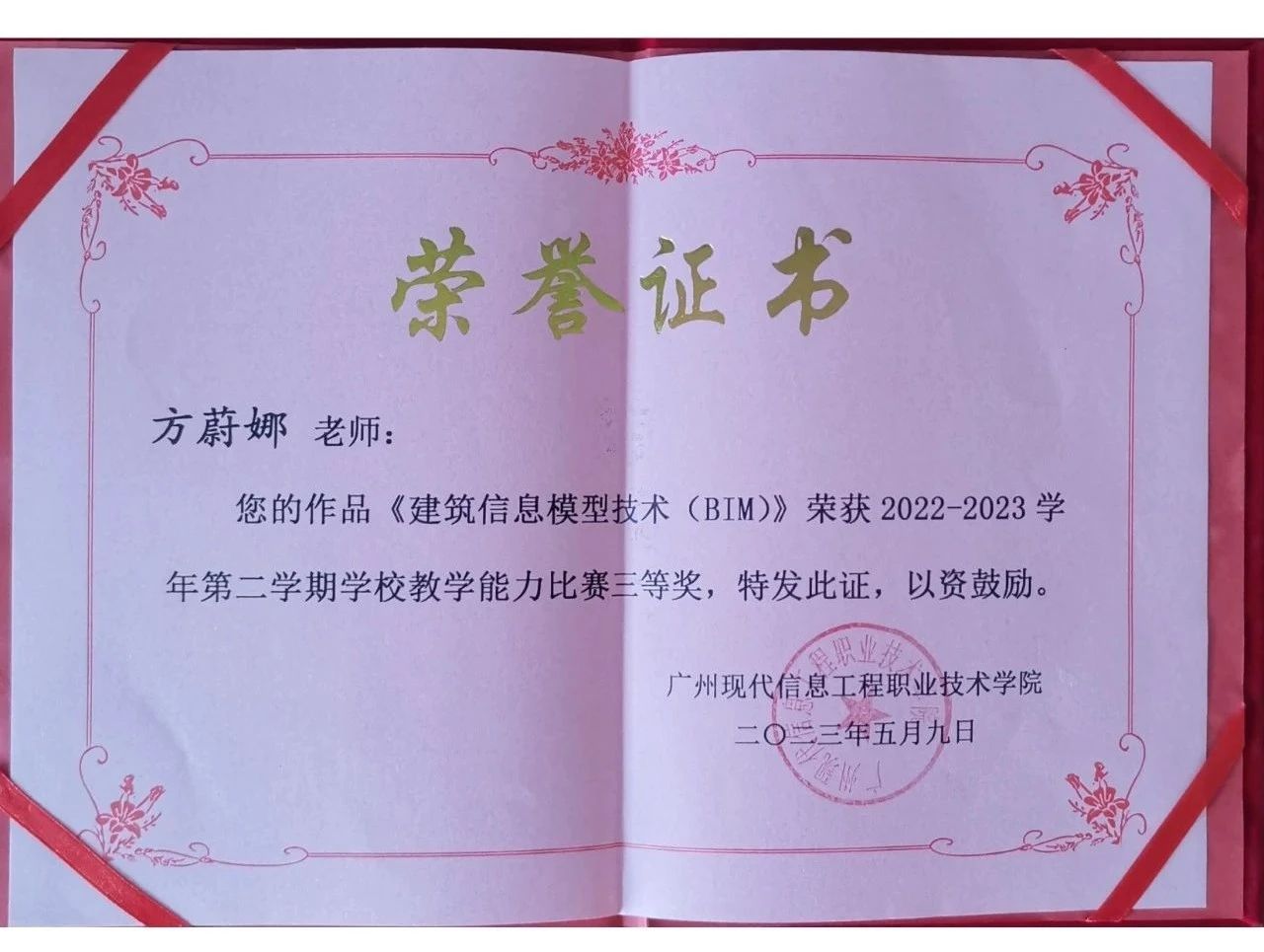 教师以育人为本。方蔚娜老师认为技能竞赛是学生专业学习的“第二课堂”。为了培养学生成为全面发展的高素质人才,她鼓励学生踊跃参加各项竞赛,通过课堂外的实践,进一步提升专业技能和综合素质。在她的悉心指导下,学生在“品茗杯”全国高校智能建造创新应用大赛、中国“互联网+”大学生创新创业大赛“青聘果杯”广东省分赛等竞赛中脱颖而出,斩获佳绩。方蔚娜老师也因指导出色,多次被评为“优秀指导教师”。