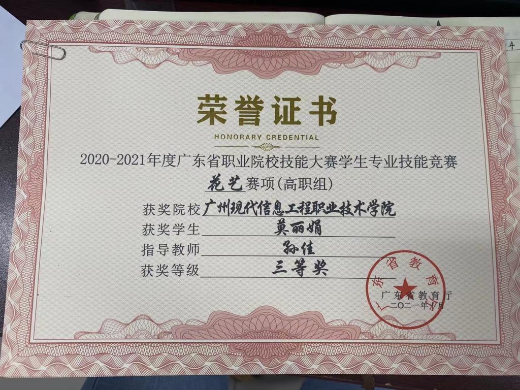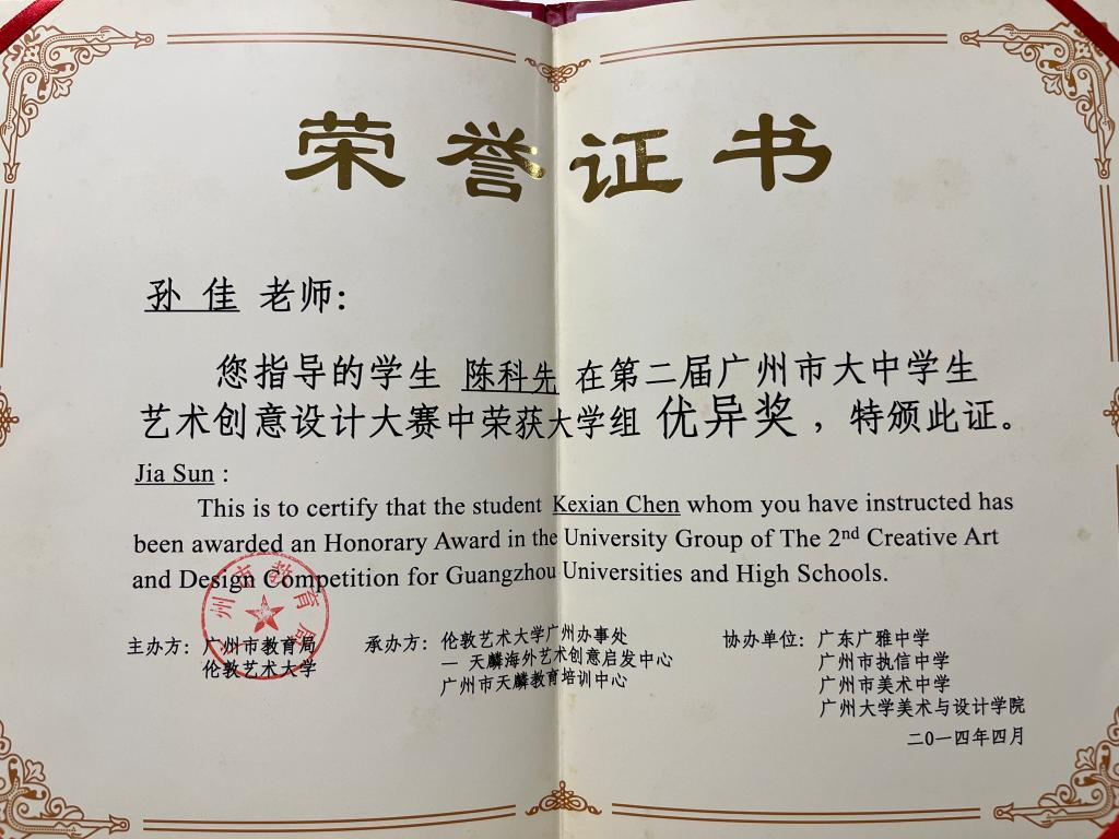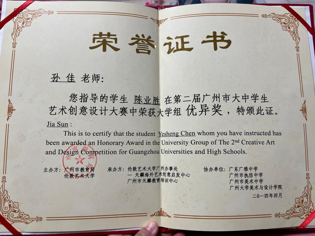 为了引导学生将所学知识运用到解决实际问题中,进一步提升实践能力,培养创新意识和团队协作精神,孙佳老师积极鼓励学生参加省、市、行业举办的各类职业技能大赛。2011年指导11级环境艺术设计专业学生姚德均参加广州市教育局与英国伦敦艺术大学联合主办的“广州市大中学生西方艺术创意设计大赛”并获得亚军;2017年指导15级装饰艺术设计专业学生参加“2017年第二届‘龙承奖’中国软装设计大赛”,斩获一等奖、二等奖、优秀奖、人气奖等多个奖项;2019年指导18级室内艺术设计专业学生何家乐和张慧敏参加广东省教育厅主办的“翰墨青春传承岭南——广东青少年书画大赛”并获得青年美术优秀奖;2021年指导19级室内艺术设计专业学生莫丽娟参加广东省教育厅主办的广东省职业技能大赛花艺赛项荣获三等奖;2021年指导20级室内艺术设计专业学生卓炜程参加广东省教育厅主办的广东省大学生艺术展演活动作品展并荣获三等奖;2021年指导20级室内艺术设计专业学生张俊浩、谭永菲、朱修全、易志衡等同学参加广东省教育厅主办的“翰墨青春传承岭南——广东青少年书画大赛”并获得青年美术优秀奖;2022年指导20级室内艺术设计专业学生李嘉慧参加广东省教育厅主办的广东省职业技能大赛花艺赛项并荣获三等奖……孙佳老师也多次被评为“优秀指导教师”。这些成绩是对学生努力拼搏的肯定,也是对孙佳老师辛勤付出的最好回报。