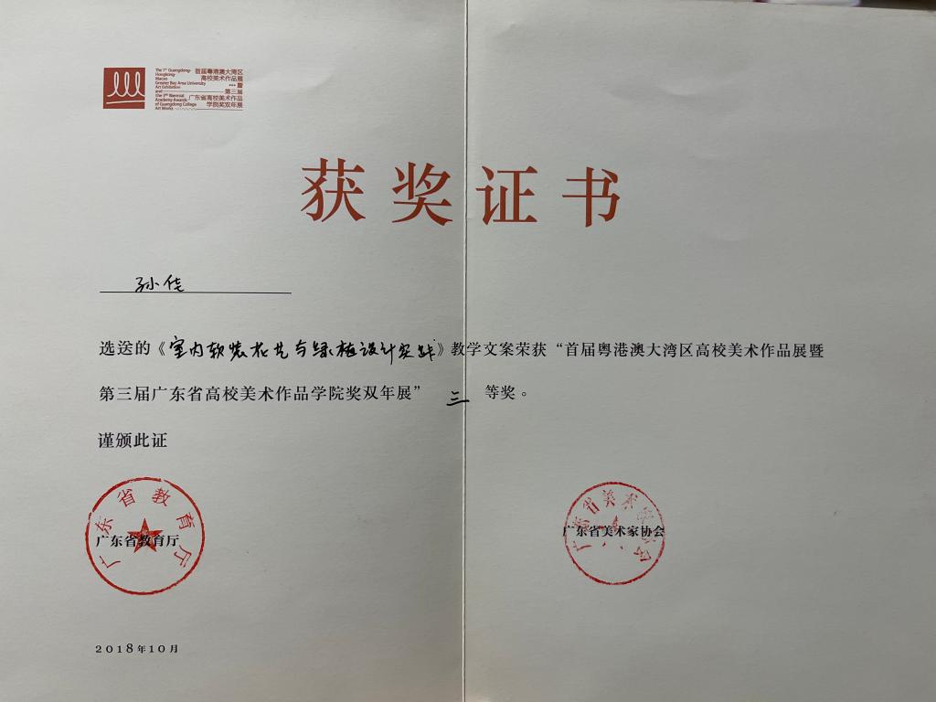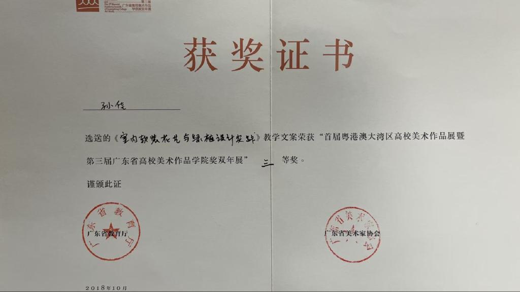 自2009年起,孙佳老师长期与广东美术馆合作开展美术馆课堂项目,探索实践教学的全新模式。目前已完成多个美术馆主题课堂项目建设工作,这些课堂项目各具特色,以艺术原作为起点,以提升学生综合素质为目标,教学形式集创新性、趣味性、实践性于一体。该项目被文化和旅游部艺术司评选为全国美术馆优秀公共教育项目,孙佳老师精心编写的教学文案《室内软装花艺与绿植设计实践》也在广东省教育厅、广东省美术家协会主办的“首届粤港澳大湾区高校美术作品展暨第三届广东省高校美术作品学院奖双年展”中获得三等奖。