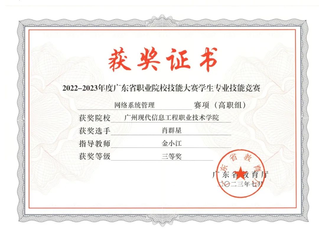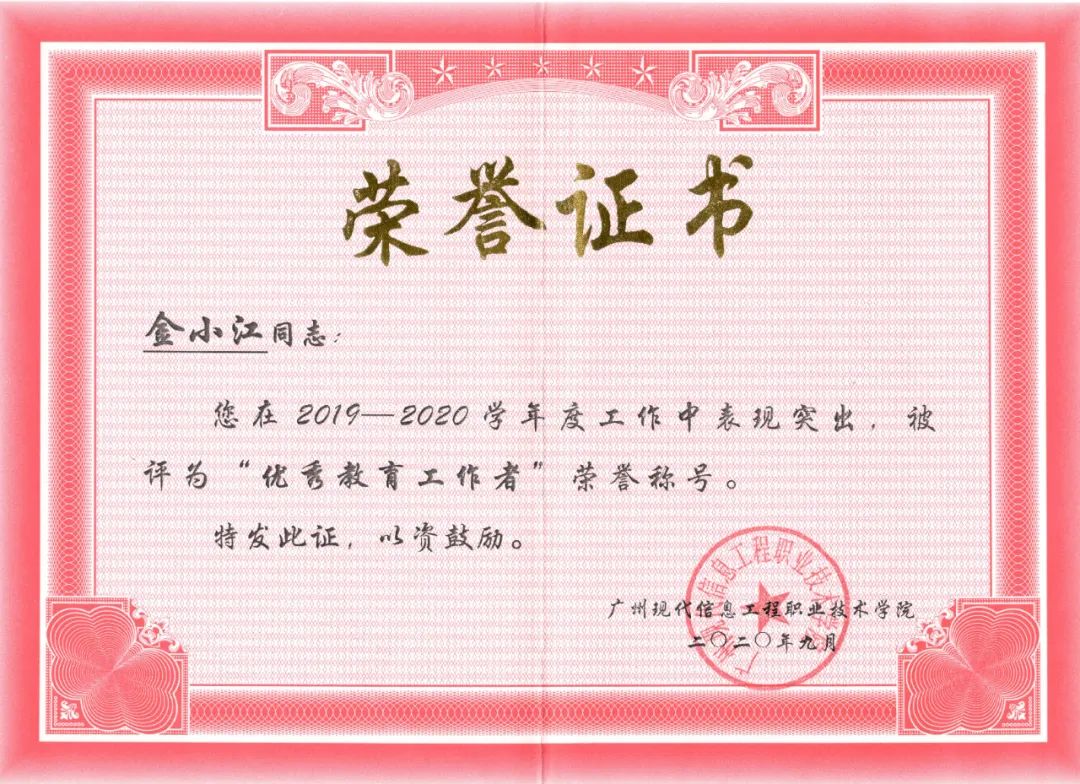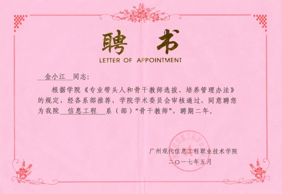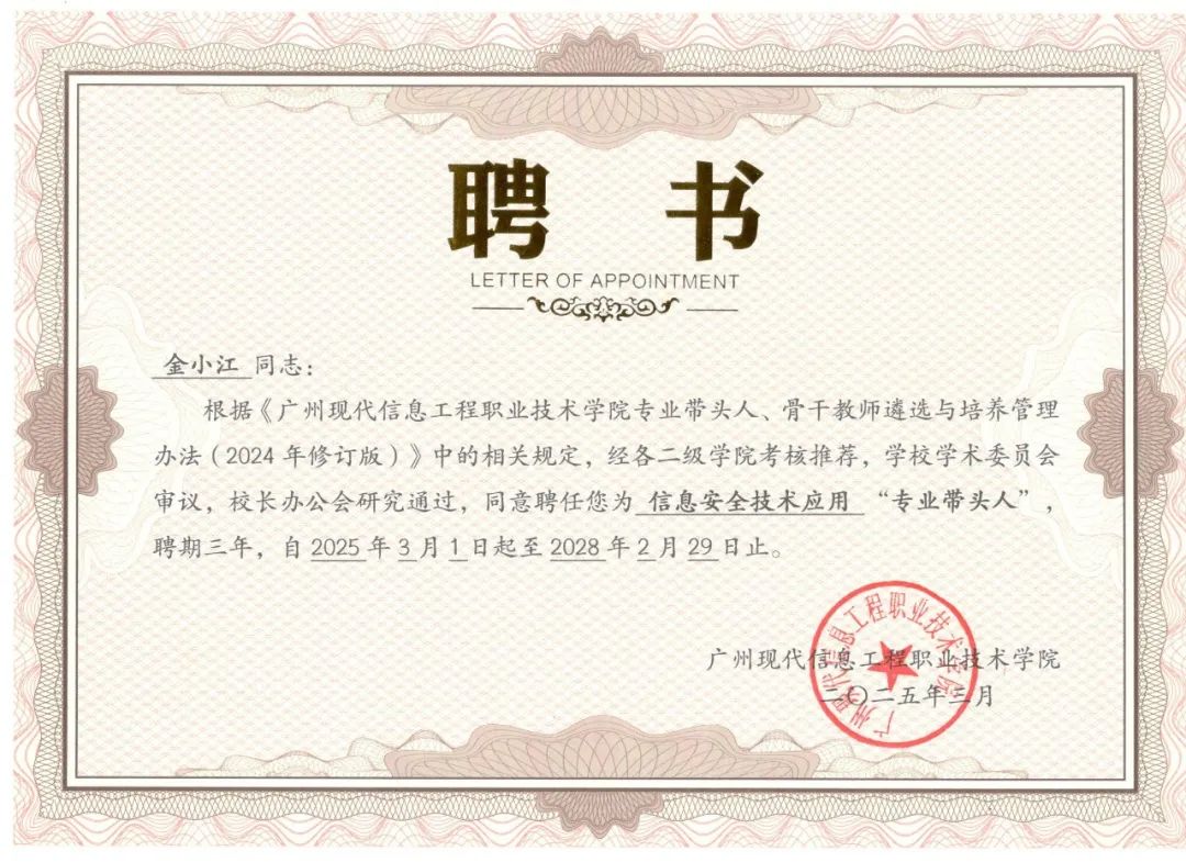 自入职betway必威西以来,金小江老师立足岗位、发奋进取、开拓创新,努力践行着“师者,传道、解惑、授业”的职责和“以学生为中心”的职业教育理念,不断提高教育教学质量,取得了突出的业绩成果。先后被评为“南粤优秀教师”“省级技能大师”、“高职中级‘双师型’教师”,并被推选为大学生网络安全知识竞赛组织委员会委员,参与全国性知识竞赛的组织工作。