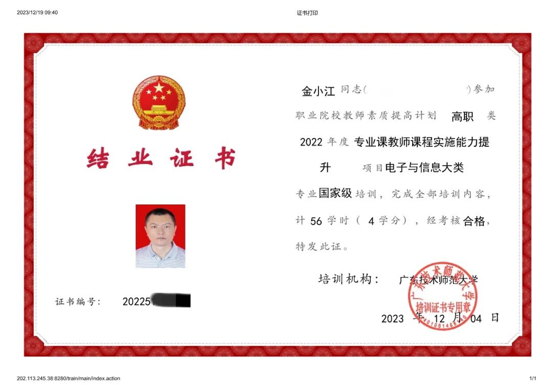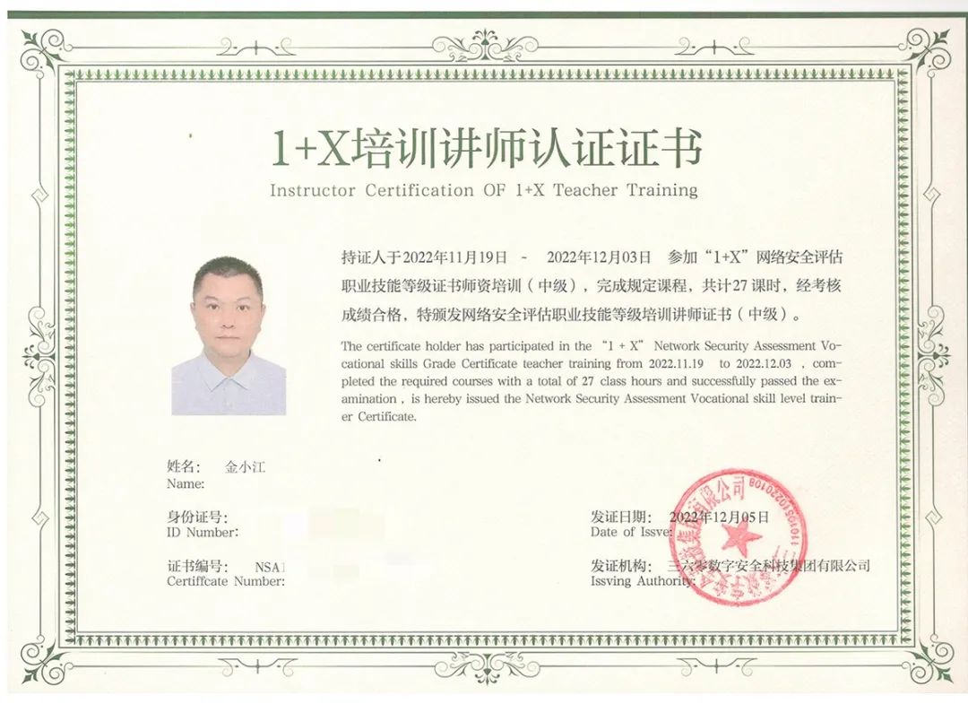 金小江老师十分注重教育教学质量和自身学术水平的提高,勤于钻研自身的专业技能和专业素质,积极抓住机会进修学习。2022年11月-12月参加“1+X”网络安全评估职业技能等级证书师资培训(中级);2022年参加职业院校教师素质提高计划高职类“2022年度专业带头人高级研修(跟岗访学)项目”电子与信息大类专业国家级培训;2023年3月,参加福建中锐网络股份有限公司举办的《网络系统规划与部署》职业技能等级考评员培训......他潜心学习,努力提升自身专业水平和业务能力,不断提高教育教学质量。