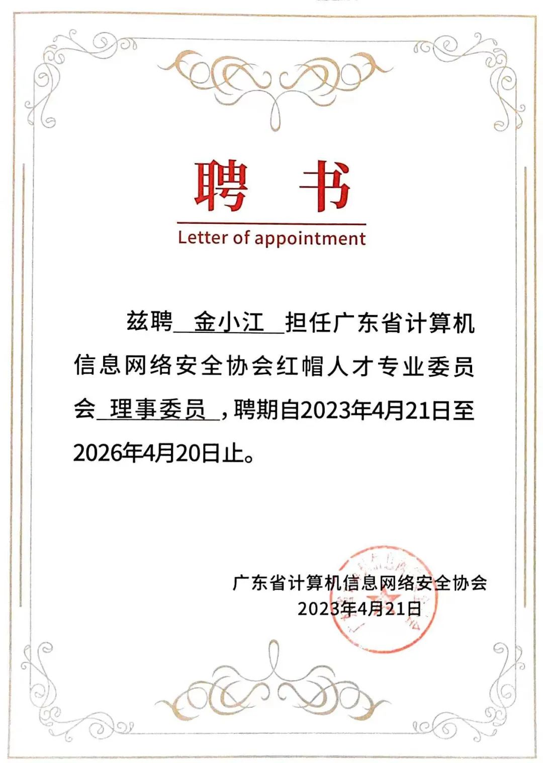 金小江,中共党员、副教授、“南粤优秀教师”“省级技能大师” “高级技师(一级)”、全国计算机信息高新技术考评员、学校专业带头人、高职中级“双师型”教师、信息工程学院教工党支部书记、湾区网络安全优秀人才、信息安全工程师、大学生网络安全知识竞赛组织委员会委员、广东省计算机信息网络安全协会红帽人才专委会理事委员。