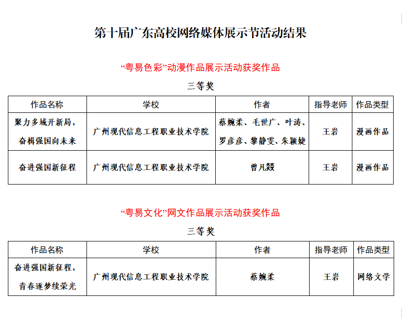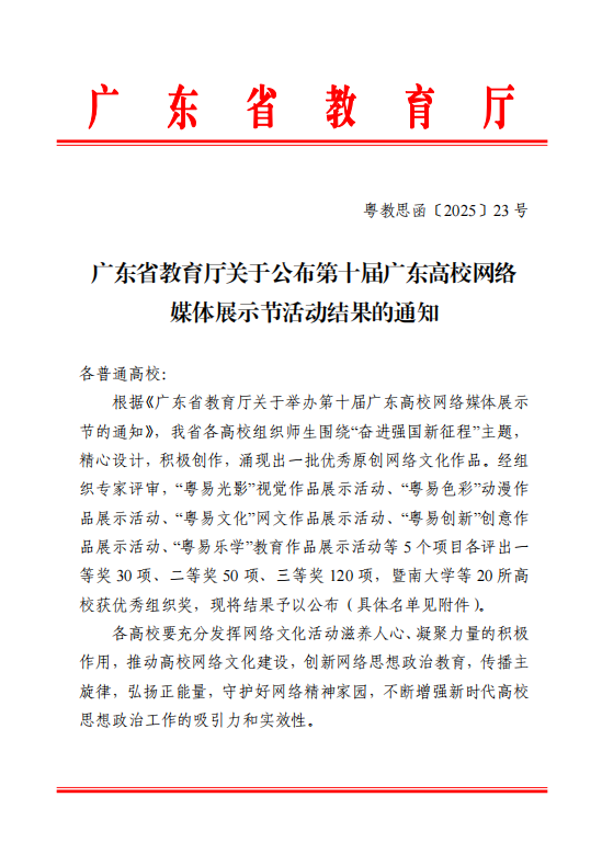 近日,广东省教育厅公布了第十届广东高校网络媒体展示节活动评审结果,我校共3项作品获奖。自活动启动以来,我校师生踊跃投稿,精心创作,我校学子凭借扎实的专业素养与创新的创作理念崭露头角,为学校赢得荣誉,营造了良好的网络宣传思想教育氛围。