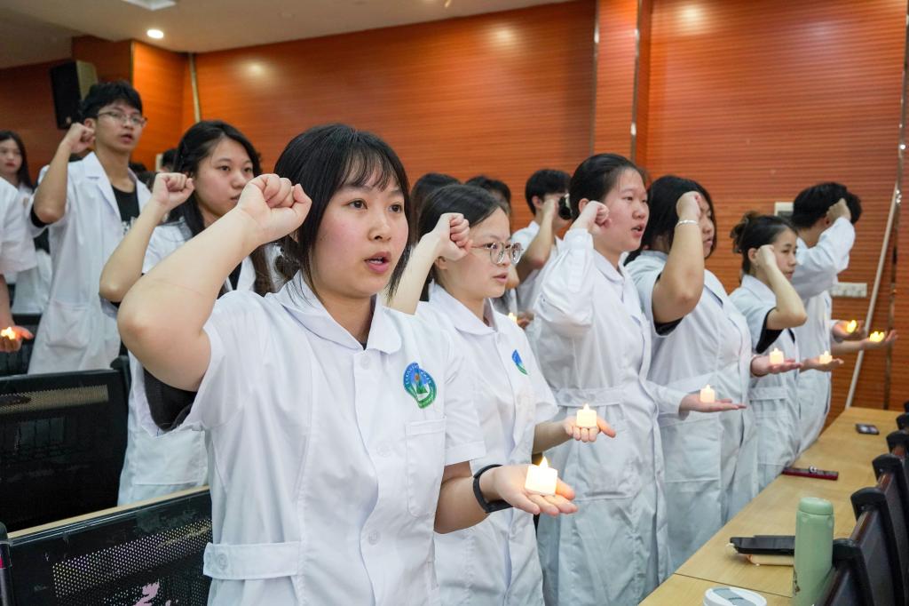 在授帽仪式上,由健康学院教师黄丹丹和梁菲菲依次为同学们戴上圣洁的燕尾帽,神圣而庄严的仪式标志着他们即将由一名护生转变为一名护士,身份不同,初心不变,信念不移。同学们庄严地举起右手,在领誓人的带领下,誓言声声回荡在报告厅内,每一位同学都神情肃穆,眼神坚定。这不仅是对南丁格尔精神的传承,更是对自己未来护理职业生涯的庄严承诺。